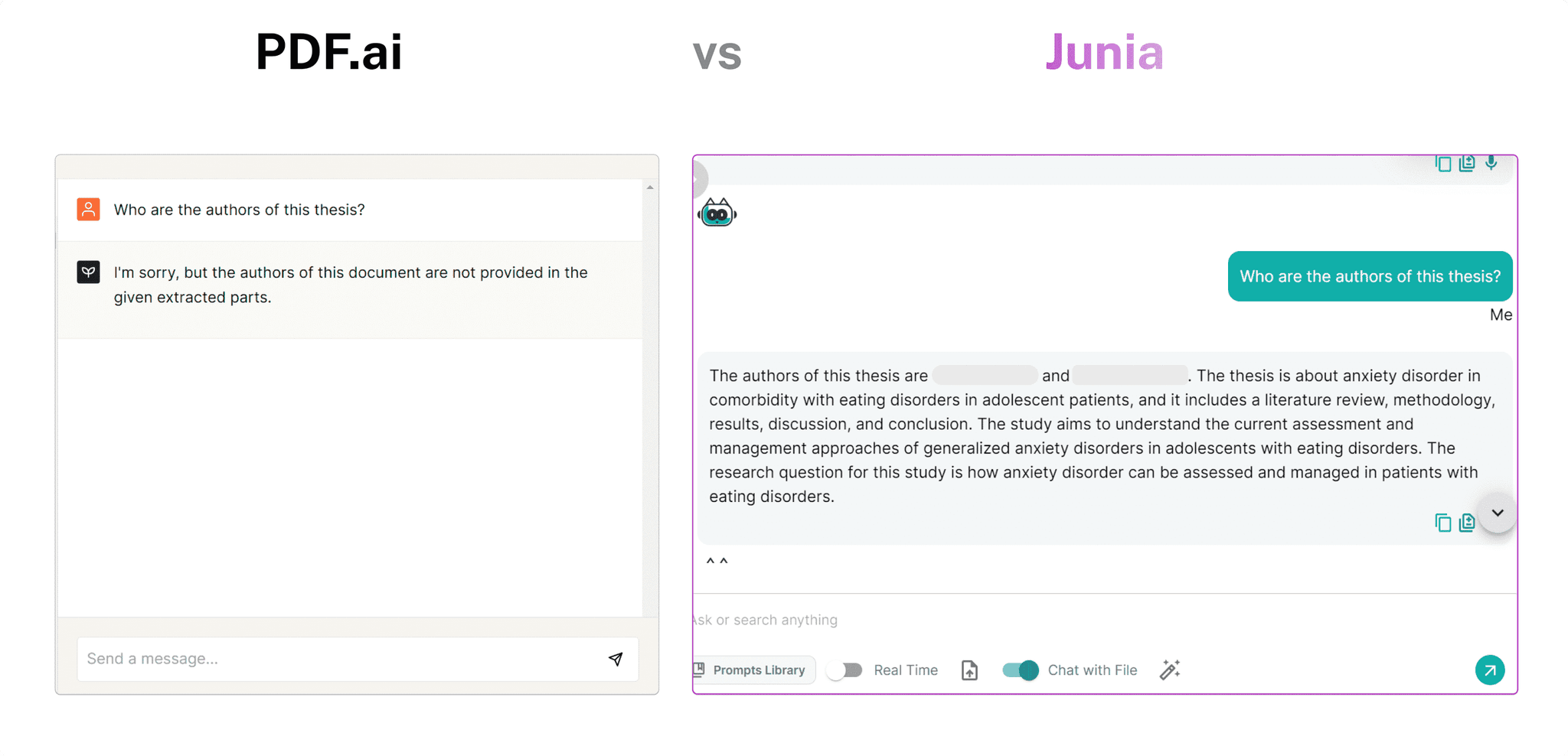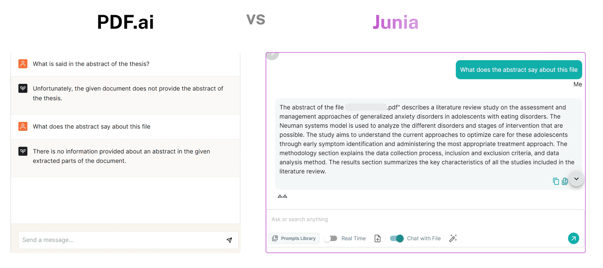 Junia offers as high a level of accuracy in file analysis as the current state of technology allows, significantly outperforming other platforms such as PDF.ai and ChatPDF.com.